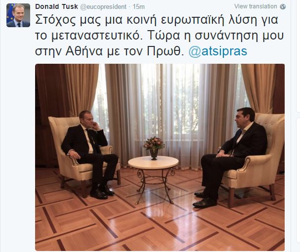 Ζήτησε όμως... χρήματα για προσλήψεις κατά τη συνάντηση με τον Τουσκ - Μίλησε για «δραστικό περιορισμό ροών στη βαλκανική οδό» - Υποσχέσεις άνευ αντικρύσματος από Τουσκ: Επανενεργοποιούμε τη Σένγκεν, η Ευρώπη δεν θα εγκαταλείψει την Ελλάδα - Προκαλούν εκ νέου οι Αυστριακοί- Σε εξέλιξη υπουργικό συμβούλιο για το προσφυγικό