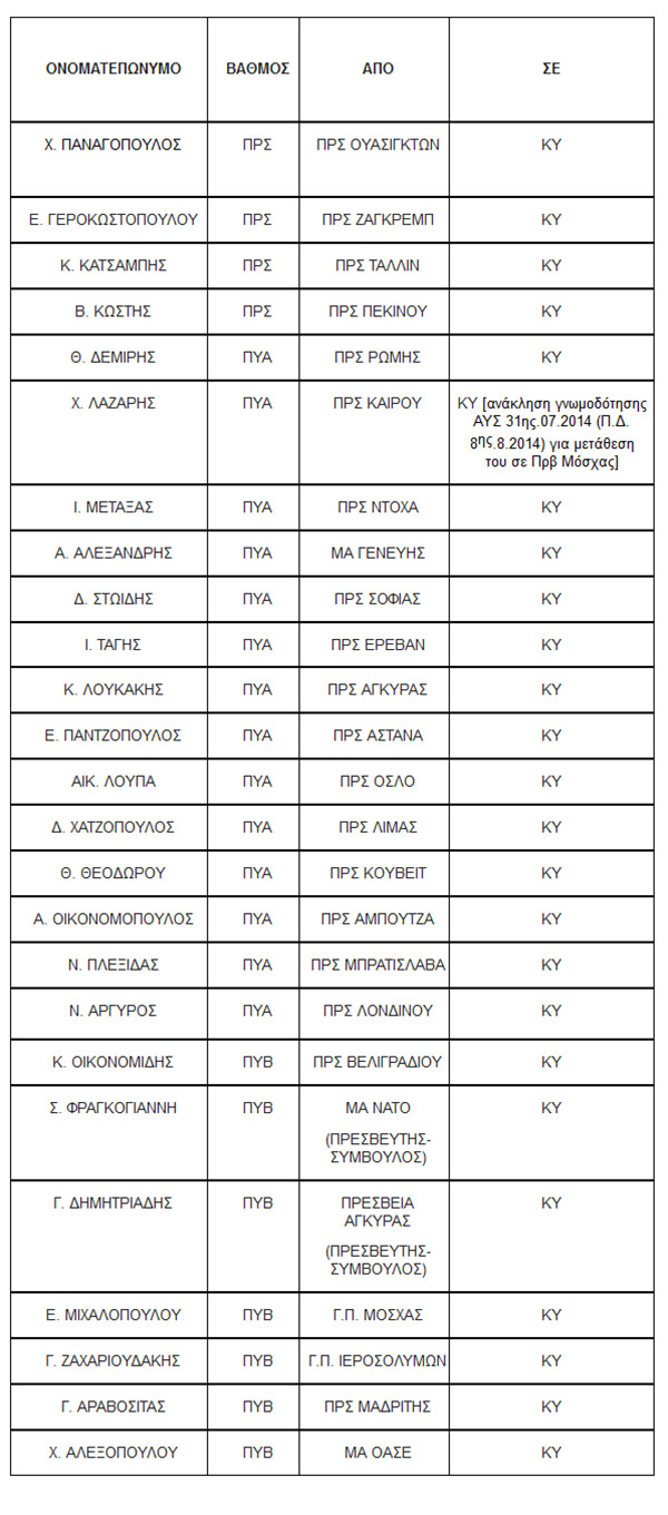 Συνολικά εικοσιπέντε διπλωμάτες (πρέσβεις και πληρεξούσιοι υπουργοί) επιστρέφουν στην Κεντρική Υπηρεσία του υπουργείου Εξωτερικών, είκοσι μεταφέρονται απο την οδό Ζαλοκώστα σε πρεσβείες και δεκαοκτώ μετακινούνται απο διπλωματικά γραφεία της Ελλάδας στο εξωτερικό σε άλλες πρεσβείες.