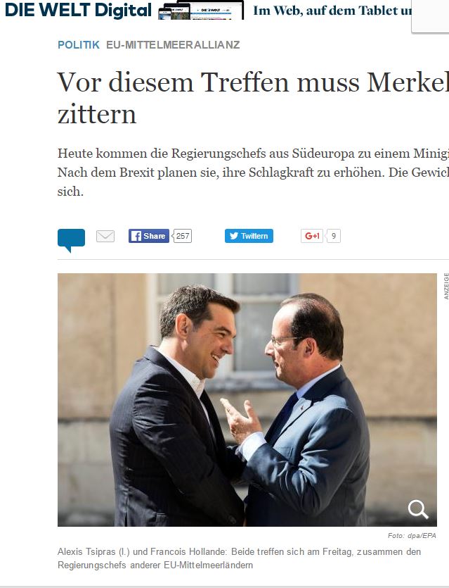 «Η μίνι συνάντηση κορυφής δεν είναι ένας γύρος πολυλογάδων, αλλά μια συνάντηση που θα πρέπει να κάνει την καγκελάριο Μέρκελ να τρέμει". Η εφημερίδα υποστηρίζει ότι ο χρόνος της συνάντησης δεν είναι τυχαίος. Γίνεται μια εβδομάδα πριν το Συμβούλιο Κορυφής της ΕΕ στη Μπρατισλάβα, όπου σύμφωνα με τον πρόεδρο του Συμβουλίου, Ντόναλντ Τουσκ μετά το Brexit η Ε.Ε πρέπει να καταλήξει σε μια κοινή διάγνωση της κατάστασης: περισσότερη ασφάλεια, περισσότερες θέσεις εργασίες, περισσότερη συνεργασία. «Οι χώρες της Μεσογείου έχουν απάντηση: λιγότερη λιτότητα, περισσότερη αλληλεγγύη, περισσότερες κοινές θέσεις», σχολιάζει η εφημερίδα. «Θέλουν περισσότερη Ευρώπη, θέλουν μία Ευρώπη, στην οποία ισχυρά κράτη όπως η Γερμανία να τα πάρουν μαζί τους. Θέλουν μια άλλη Ευρώπη».