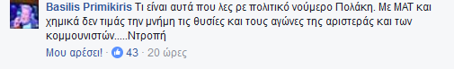 Basilis Primikiris Τι είναι αυτά που λες ρε πολιτικό νούμερο Πολάκη. Με ΜΑΤ και χημικά δεν τιμάς την μνήμη τις θυσίες και τους αγώνες της αριστεράς και των κομμουνιστών.....Ντροπή