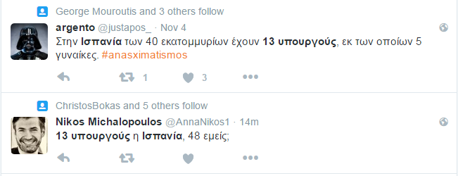 Τα μέσα κοινωνικής δικτύωσης, με αφορμή την ορκωμοσία της νέας κυβέρνησης Τσίπρα μετά τον ανασχηματισμό, θυμίζουν ότι η Ελλάδα των 11 εκατομμυρίων κατοίκων και της σοβαρής οικονομικής κρίσης έχει ένα υπουργικό συμβούλιο 48 υπουργών, παρά τις παλαιότερες υποσχέσεις για ολιγομελές σχήμα. Με 46 εκατομμύρια κατοίκους η Ισπανία απέκτησε προ τριημέρου νέα κυβέρνηση, η οποία αποτελείται από 13 υπουργού.