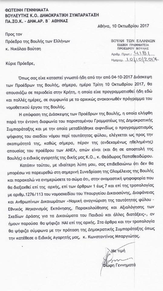 Η επιστολή της κυρίας Γεννηματά στον πρόεδρο της Βουλής: