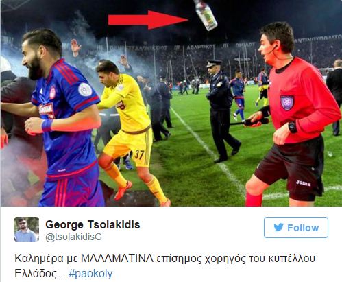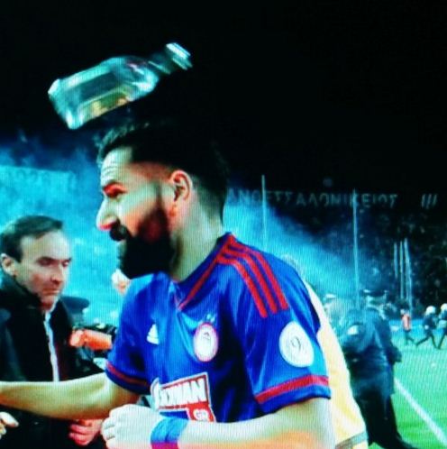 Όπως φαίνεται στις φωτογραφίες που ακολουθούν, κατά την αποχώρηση των ποδοσφαιριστών και των διαιτητών για τα αποδυτήρια πετάχτηκε – μεταξύ άλλων – ένα γυάλινο μπουκάλι μαλαματίνας!