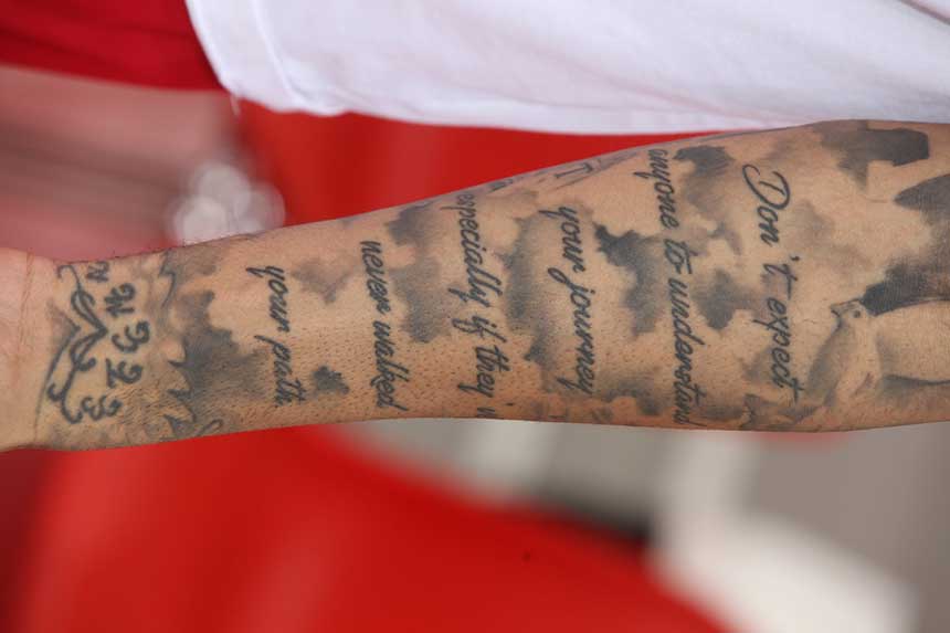 Και εδώ υπήρχε ανάλογο πρόβλημα με αυτό που αντιμετωπίσαμε με τον Γιώργο Πρίντεζη. Αλλά ο Αμερικανός ήταν πιο διαλλακτικός και αφού έκανε μια γρήγορη καταμέτρηση, εξήγησε γιατί είναι 15. Το πρώτο του το έκανε στα 18 και σχεδόν γέμισε τη μισή του πλάτη. Κάθε ένα από αυτό έχει το δικό του νόημα και κανένα δεν είναι απλό σχέδιο. Τα περισσότερα σχετίζονται με την οικογένεια του, μερικά εξ αυτών συμβολίζουν και του θυμίζουν την γειτονιά στην οποία μεγάλωσε, ένα όνομα ενός πολύ αγαπημένου του προσώπου που έφυγε πρόωρα από τη ζωή και ακόμη ένα που σχετίζεται με το μπάσκετ.