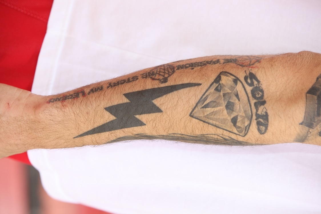 Και εδώ, όπως και στην περίπτωση των Πρίντεζη και Γκριν, έγινε αρκετή κουβέντα για το πόσα είναι τα τατουάζ και πως μετράει το καθένα. Τελικά, καταλήξαμε κάπου μεταξύ 15-20. Διαλέγετε και παίρνετε. Ακριβής αριθμός δεν προέκυψε. Ο Ιταλός γκαρντ έκανε το πρώτο του τατουάζ στα 15 του και αυτό που πάντα ξεχωρίζει, από όλα όσα έχει κάνει, είναι το όνομα της μητέρας του, Κάτια, που έχει στον καρπό του δεξιού του χεριού.