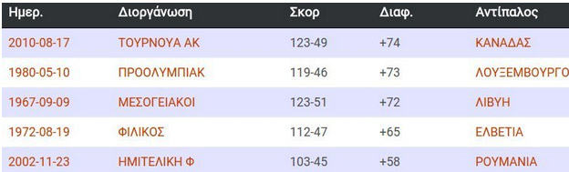Μεγαλύτερη όλων παραμένει το +74 επί του Καναδά (123-47 στις 17/8/10) στο ΟΑΚΑ στο πλαίσιο της προετοιμασίας εν όψει Mundobasket ’10.