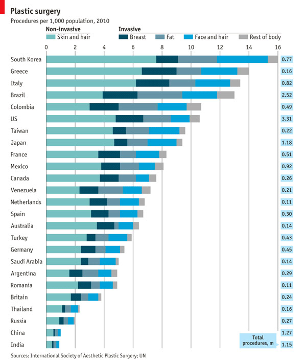Σύμφωνα με τον Διεθνή Οργανισμό Αισθητικής Πλαστικής Χειρουργικής, το 2010 οι Ηνωμένες Πολιτείες ήταν πρώτες στον αριθμό αισθητικών επεμβάσεων, χειρουργικές και μη, με 3,3 εκατομμύρια ετησίως. Η Βραζιλία κατατάσσεται δεύτερη με 2,5 εκατομμύρια επεμβάσεις. Αν όμως προσαρμόσουμε τα δεδομένα αναλογικά με τον πληθυσμό κάθε χώρας, διαπιστώνουμε πως πρώτη στις επεμβάσεις είναι η Νότια Κορέα, όπου είναι μόδα οι επεμβάσεις βλεφαροπλαστικής, ενώ δεύτερη είναι η Ελλάδα και τρίτη η Ιταλία, όπως φαίνεται στον παρακάτω πίνακα.