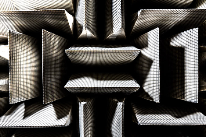 Το εσωτερικό του περιβάλλεται από στοιχεία σφηνοειδούς σχήματος, φτιαγμένα από απορροφητικό υλικό, τοποθετημένα σε φαινομενικά ανομοιόμορφη διάταξη. Αντί για πάτωμα, ένα μεταλλικό δίχτυ συγκρατεί ουσιαστικά αιωρούμενους τους επισκέπτες και τον όποιο εξοπλισμό δοκιμών, δημιουργώντας ένα ομοιογενές περιβάλλον εξάλειψης των αντηχήσεων. Ο θόρυβος στο εσωτερικό του μετρήθηκε στα -20 ντεσιμπέλ (dB), πολύ κοντά στον ελάχιστο θεωρητικό θόρυβο που προκαλεί η τυχαία κίνηση στερεών σωματιδίων μέσα σε υγρό ή αέριο (κίνηση Μπράουν, -23 dB).