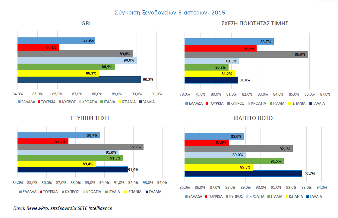 Τα στοιχεία αφορούν το 2015 και βασίζονται στις αξιολογήσεις των πελατών ξενοδοχείων σε Ελλάδα, Κύπρο, Τουρκία, Γαλλία, Κροατία, Ισπανία και Ιταλία από το σύστημα της Review Pro, με βάση και τη σχετική επεξεργασία από το Sete Intelligence.