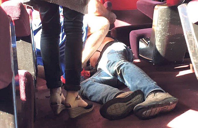 Ο Αλεκ Σκαρλάτος που είχε θητεύσει στο Αφγανιστάν και ως εκ τούτου είχε εμπειρία από όπλα άκουσε τον θόρυβο του όπλου. Τότε σηκώθηκε έντρομος από την θέση του. Αμέσως μετά ακούγεται μία ριπή. Τρομαγεμένοι επιβάτες προσπαθούν να καλυφθούν. Εκείνη την ώρα ο Έλληνας ομογενής ως από μηχανής θεός φωνάζει στους φίλους του «πιάστε τον». Εκείνοι χωρίς να χάσουν χρόνο ορμούν πάνω στον ένοπλο Μαροκινό.