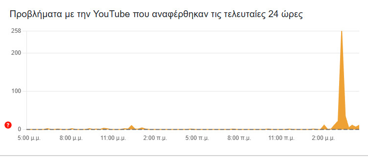 Σύμφωνα με το downdetector, μετά τις 14:30 υπήρξαν περισσότερες από 10.000 αναφορές για προβλήματα σύνδεσης στο YouTube. Πολλοί χρήστες που προσπαθούσαν να συνδεθούν στην πλατφόρμα είδαν στις οθόνες τους αυτό το μήνυμα:User reports indicate problems with YouTube since 7:16 AM EST.