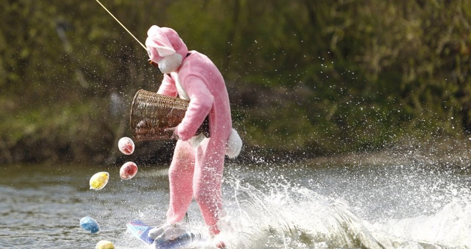 Ροζ κουνελάκι για τις ανάγκες του Πάσχα ντύθηκε ένας Γερμανός, εκπλήσσοντας όσους βρέθηκαν στη συγκεκριμένη λίμνη κοντά στο Αμβούργο, με τις φιγούρες του, επάνω στο wakeboard του.