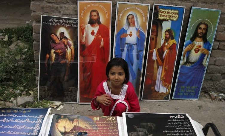 Μία μικρή Πακιστανή Χριστιανή ανάμεσα σε εικόνες προς πώληση, στην πόλη Πεσαβάρ.