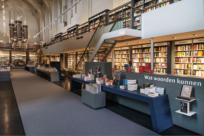 Πολυέλαιοι, θρησκευτικά αντικείμενα και περίτεχνα βιτρό στα παράθυρα συνθέτουν μια κατανυκτική ατμόσφαιρα, ό,τι πρέπει για τους φίλους του βιβλίου. Αυτά ακριβώς τα χαρακτηριστικά έχει μια δομινικανή εκκλησία του 15ου αιώνα στην ολλανδική πόλη Zwolle, η οποία μεταμορφώθηκε σε βιβλιοπωλείο, διατηρώντας την ιστορική αξία του κτιρίου.