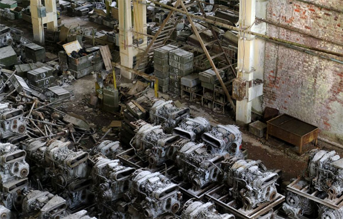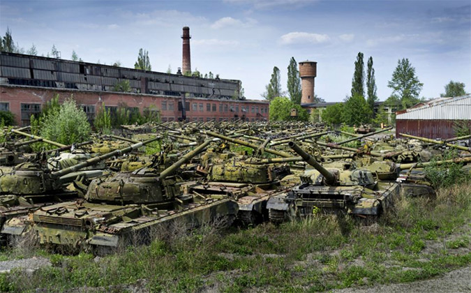 Οι απίθανες φωτογραφίες δείχνουν περισσότερα από 400 άρματα, παρατεταγμένα στην κρυφή αυτή αποθήκη, που απέχει 20 μίλια από τα σύνορα με τη Ρωσία.