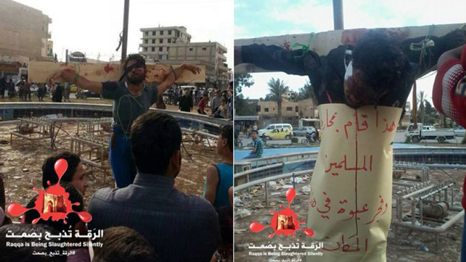 Μόνο σοκ μπορούν να προκαλέσουν οι εικόνες από τη σταύρωση δύο ανδρών σε κεντρική πλατεία της Ράκα στη Βόρειο Συρία.