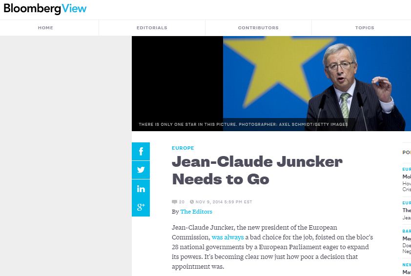 Ο Jean-Claude Juncker, ο νέος πρόεδρος της Ευρωπαϊκής Επιτροπής ήταν πάντα μια κακή επιλογή για τη δουλειά, αναφέρει σε άρθρο του το Bloomberg, υποστηρίζοντας ότι «πλέον έχει γίνει σαφές πόσο κακή απόφαση ήταν αυτός ο διορισμός».