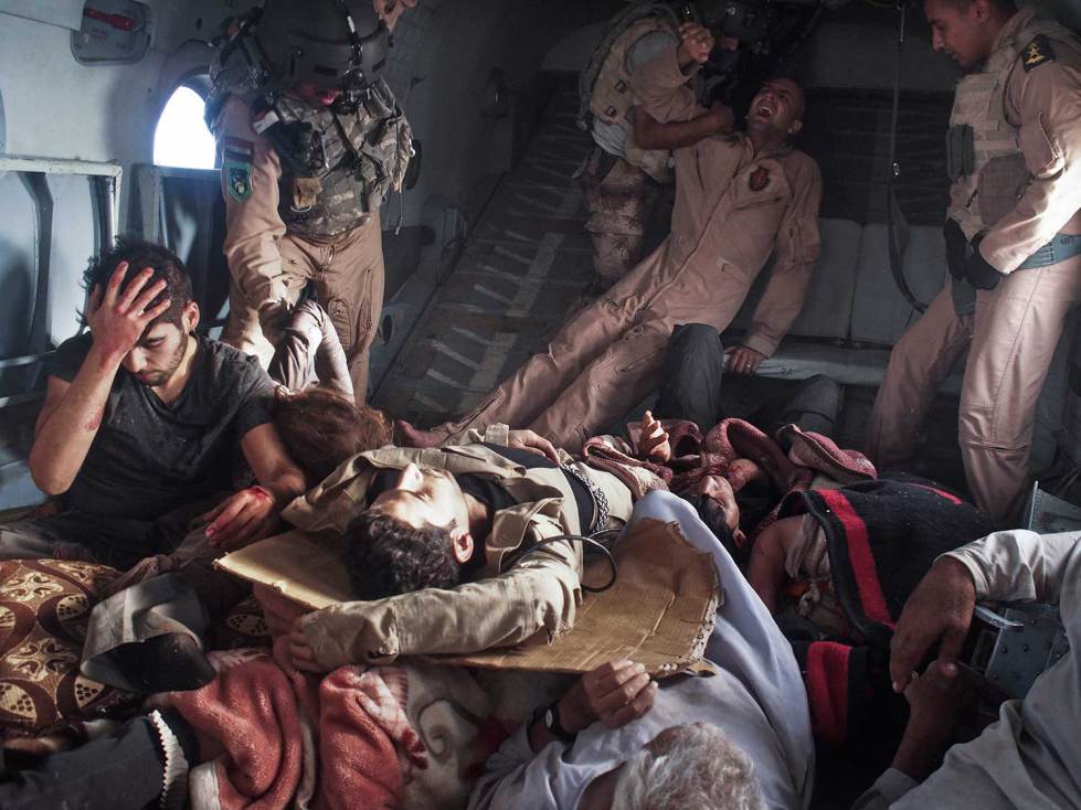 Ιράκ-Βουνά Σινγκάρ- 12 Αυγούστου: Αεροπλάνο μεταφέρει τραυματία μετά από επίθεση αυτοκτονίας των τρομοκρατών του Ισλαμικού Κράτους μέσε σα γειτονία του Ιράκ, σκοτώνοντας δεκάδες ανθρώπους και τραυματίζοντας εκατοντάδες.