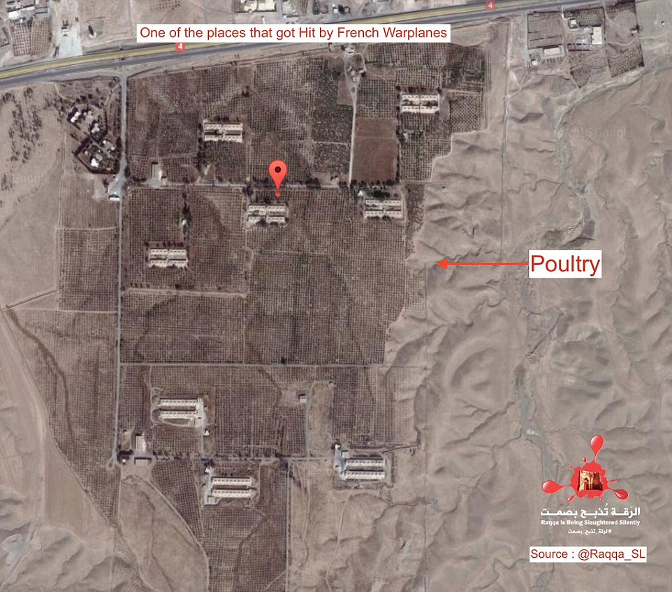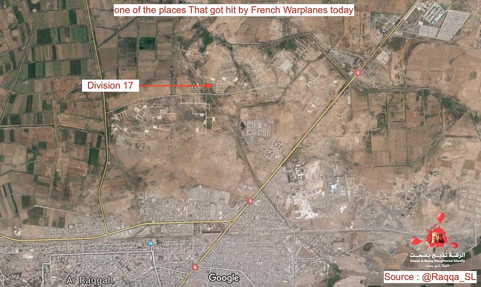 Η οργάνωση ακτιβιστών κατά του ΙΚ, "Η Ράκα σφαγιάζεται σιωπηρά", ανακοίνωσε ότι οι γαλλικές επιδρομές έπληξαν τη "Μεραρχία 17", ένα στρατόπεδο εκπαίδευσης που περιλαμβάνει και αποθήκες όπλων στη Ράκα και ανάρτησε χάρτες των τοποθεσιών τους στο λογαριασμό της στο Twitter. Σημείωσε ότι δεν υπάρχουν αναφορές για θύματα μέχρι τώρα.