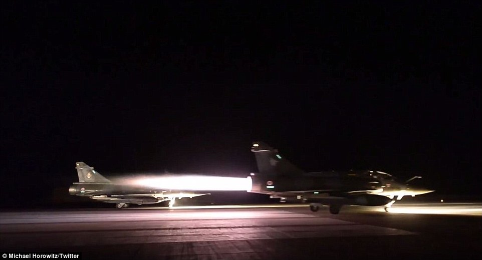 Δώδεκα αεροσκάφη, εκ των οποίων δέκα καταδιωκτικά, τύπου Mirage 2000N, Mirage 2000Ds και Ráfales, απογειώνονται στις 19.50 τοπική ώρα από τα Ηνωμένα Αραβικά Εμιράτα και την Ιορδανία.