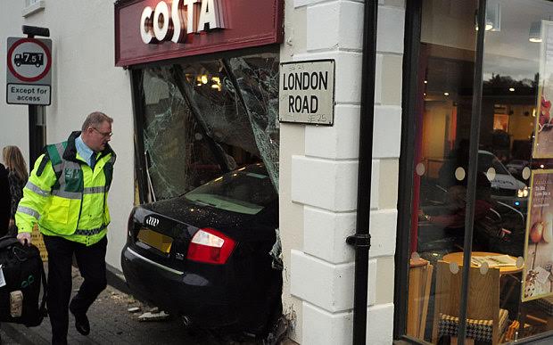 Το όχημα κατέληξε σε καφετέρια της αλυσίδας Costa Coffee με ιλιγγιώδη ταχύτητα σπάζοντας τη βιτρίνα και σκορπώντας τον πανικό.