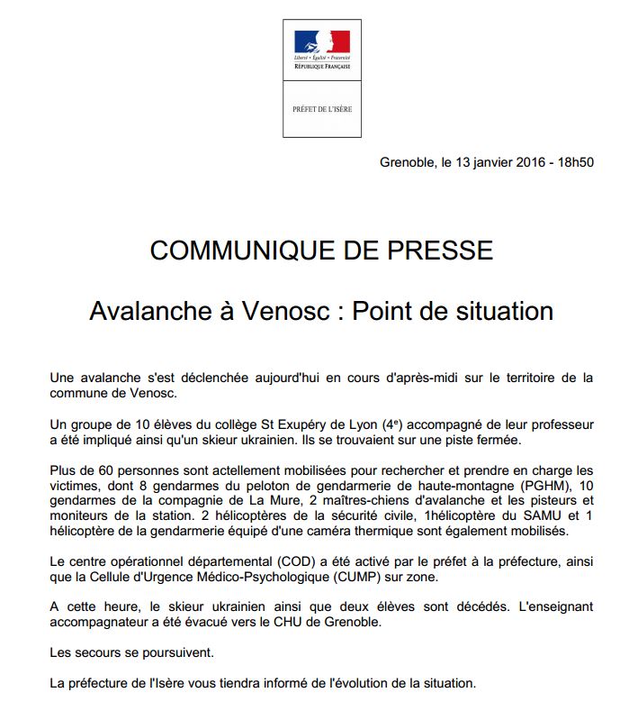 Σύμφωνα με το Γαλλικό Πρακτορείο Ειδήσεων δέκα μαθητές από το Λύκειο Saint-Exupéry της Λυών καταπλακώθηκαν από χιονοστιβάδα ενώ έκαναν σκι στο χειμερινό θέρετρο Les Deux Alpes.