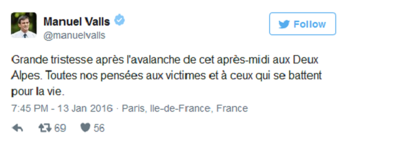 Τη θλίψη του για την τραγωδία εξέφρασε ο Γάλλος πρωθυπουργός, Μανουέλ Βαλς, σε ανάρτησή του στον προσωπικό του λογαριασμό στο Twitter γράφοντας: «Μεγάλη θλίψη για τη χιονοστιβάδα στο (θέρετρο) Deux Alpes. Η σκέψη μας πηγαίνει στα θύματα και σε εκείνους που αγωνίζονται για τη ζωή τους».