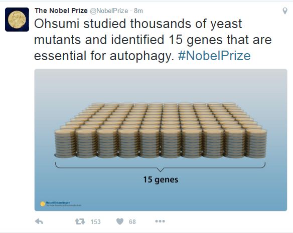 «Οι ανακαλύψεις του Οσούμι οδήγησαν σ' ένα νέο παράδειγμα όσον αφορά την κατανόησή μας για το πώς το κύτταρο ανακυκλώνει το περιεχόμενό του», αναφέρει η Επιτροπή Νόμπελ του Ινστιτούτου Καρολίνσκα της Σουηδίας στην ανακοίνωσή της για το βραβείο που συνοδεύεται από χρηματικό έπαθλο 8 εκατ. σουηδικών κορωνών (830.000 ευρώ).