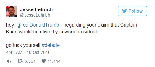 «Aντε γαμ@@@@» ήταν το σχόλιο που έκανε στο twitter ο Jesse Lehrich, εκπρόσωπος για θέματα εξωτερικής πολιτικής του επιτελείου της Χίλαρι Κλίντον, κατά τη διάρκεια διεξαγωγής του debate των δύο υποψηφίων που διεκδικούν το προεδρικό αξίωμα στις Ηνωμένες Πολιτείες Αμερικής.