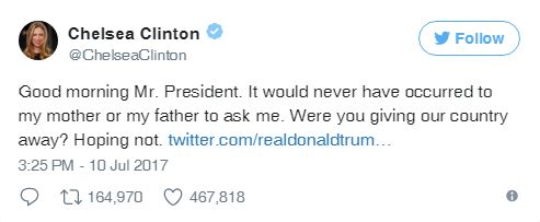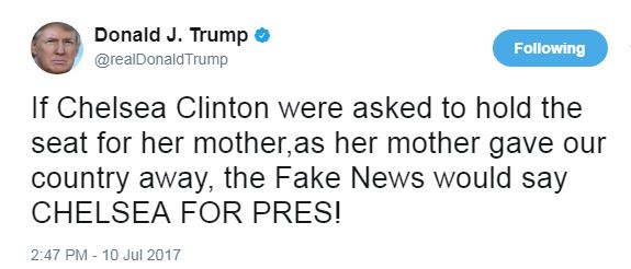 έγραψε στη συνέχεια στο αγαπημένο μέσο κοινωνικής δικτύωσης, το Twitter: «Αν είχε ζητηθεί από την Τσέλσι Κλίντον να πάρει τη θέση της μητέρας της, καθώς η Χίλαρι θα παρέδιδε τη χώρα μας, οι Fake News (ψευδείς ειδήσεις) θα έλεγαν ΤΣΕΛΣΙ ΓΙΑ ΠΡΟΕΔΡΟΣ».