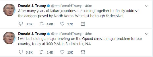 Εξάλλου ο Τραμπ έκανε γνωστό επίσης μέσω του Twitter πως θα προβεί σήμερα σε ενημέρωση σχετικά με την κρίση των οπιοειδών στις ΗΠΑ.