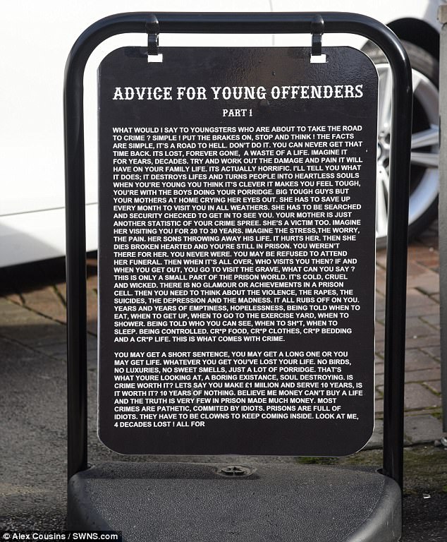 «Τι θέλω να πω στους νέους που είναι έτοιμοι να πάρουν το δρόμο της παρανομίας; Είναι απλό. Πατήστε φρένο. Σταματήστε και σκεφτείτε. Τα πράγματα είναι απλά, είναι ο δρόμος προς την κόλαση. Μην το κάνετε. Δεν μπορείτε να γυρίσετε πίσω το χρόνο. Χάνεται, φεύγει για πάντα. Μια ζωή χαμένη. Σκεφτείτε το, για χρόνια, δεκαετίες. Προσπαθήστε να σκεφτείται τι ζημιά και πόνο θα προκαλέσετε στη ζωή των οικογενειών σας. Είναι τρομακτικό. Θέλω να σας πω τι κάνει (το έγκλημα): καταστρέφει ζωές και μετατρέπει τους ανθρώπους σε ψυχές χωρίς καρδιά. Όταν είστε νέοι νομίζετε ότι είναι έξυπνο να κάνετε τους σκληρούς. Μεγάλα σκληρά αγόρια, αλλά οι μητέρες σας στο σπίτι κλαίνε. Θα πρέπει κάθε μήνα να σας επισκέπτεται. Θα πρέπει να την ελέγχουν πριν μπει να σας δει. Η μητέρα σας είναι άλλη μία στατιστική του εγκλήματός σας. Είναι ένα θύμα ακόμη. Σκεφτείτε τη να σας επισκέπτεται για 20 με 30 χρόνια στη φυλακή. Σκεφτείτε την αγωνία και τον πόνο. Ο γιος της πέταξε στα σκουπίδια τη ζωή του. Την πονάει. Μετά πεθαίνει με ραγισμένη καρδιά κι εσείς είστε ακόμη στη φυλακή. Δεν ήσασταν εκεί για αυτή. Δεν θα είστε ποτέ. Μπορεί να μην σας αφήσουν να πας στην κηδεία της. Τότε, όταν όλα θα έχουν τελειώσει ποιός θα σας επισκεφθεί. Εάν και όποτε βγείτε από τη φυλακή και επισκεφθείτε τον τάφο της, τι μπορείτε να πείτε τότε; Αυτό είναι μόνο ένα μικρό κομμάτι του κόσμου της φυλακής. Είναι κρύος, σκληρός και κακός. Δεν υπάρχουν λαμπερά επιτεύγματα σε ένα κελί φυλακής», έγραφε μεταξύ άλλων το μήνυμα του Μπρόνσον.