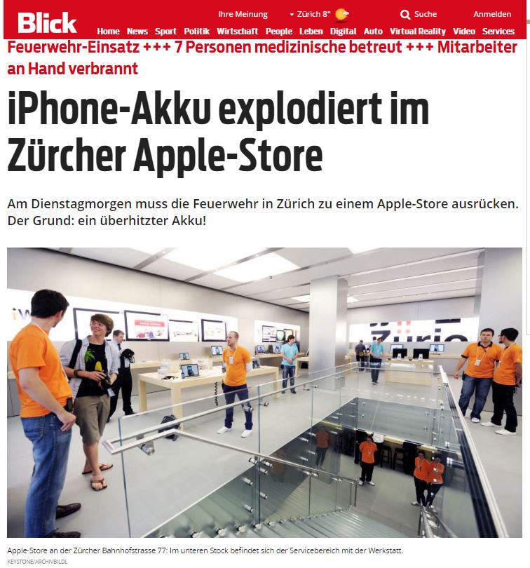 Συναγερμός σήμανε λίγο μετά τις 10 το πρωί (ώρα Ελβετίας) στην πυροσβεστική της Ζυρίχης όταν ενημερώθηκε για έκρηξη iPhone σε Apple Store από την οποία τραυματίστηκαν ελαφρά επτά άτομα.