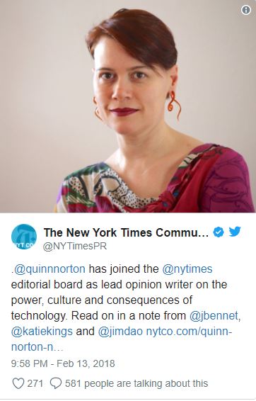 Με συνοπτικές διαδικασίες ξεφορτώθηκαν το νεότερο μέλος της συντακτικής τους ομάδας οι New York Times όταν, μερικές ώρες μετά την πρόσληψη της Quinn Norton, άρχισαν να κάνουν τον γύρο του διαδικτύου ορισμένες αμφιλεγόμενες αναρτήσεις που είχε κάνει στο παρελθόν.