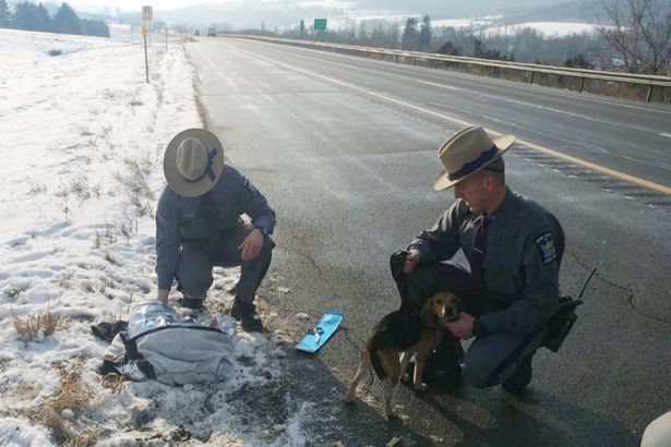 Τα άτυχα beagle έπεσαν στον παράδρομο και τραυματίστηκαν σοβαρά. Ο οδηγός σταμάτησε αμέσως, κατέβηκε και είδε τα δυο σκυλιά αιμόφυρτα στον δρόμο, ενώ ένα περιπολικό που είδε το συμβάν, σταμάτησε επίσης και κάλεσε πρώτες βοήθειες για τα άτυχα ζωντανά.